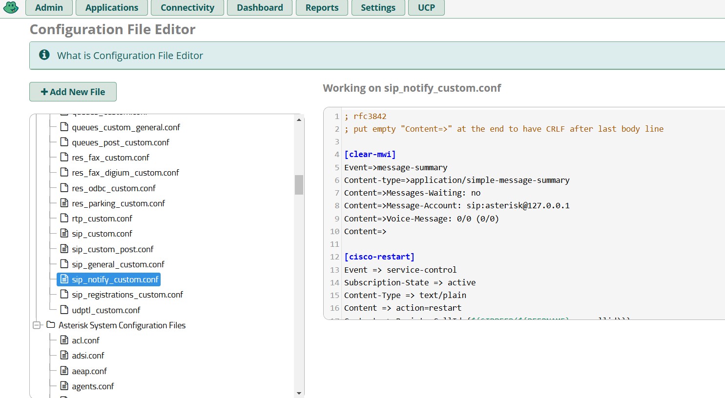 2/ Under the file list section, under "Asterisk Custom Configuration Files", search the file "sip_notify_custom.conf".